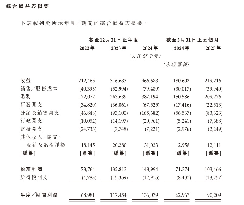 于2022年、2023年、2024年及截至2025年5月31日止五个月,于各年度/期间来自前五大客户的收益合共分别为人民币1.81亿元、人民币2.32亿元、人民币3.39亿元及人民币1.79亿元,分别占公司总收益的85.1%、73.3%、 72.6%及71.7%。