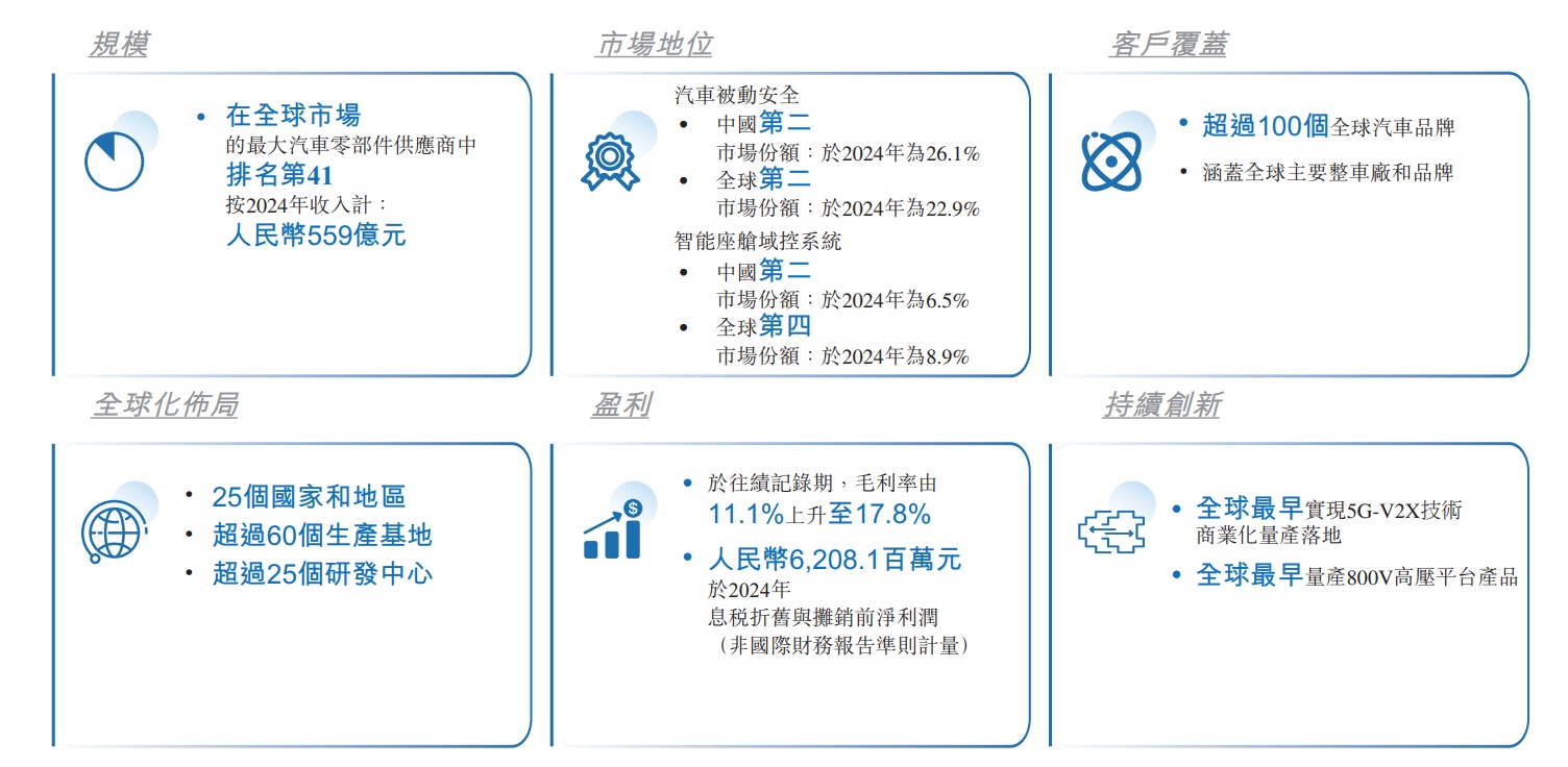 招股书显示,均胜电子是智能汽车科技解决方案提供商,提供汽车零部件行业关键领域(主要为汽车电子和汽车安全)的先进产品和解决方案。公司业务专注于汽车零部件的研发、制造和销售,于2024年全球汽车零部件行业中排名第四十一,根据弗若斯特沙利文的资料,按收入计,公司是中国和全球第二大汽车被动安全产品供货商。