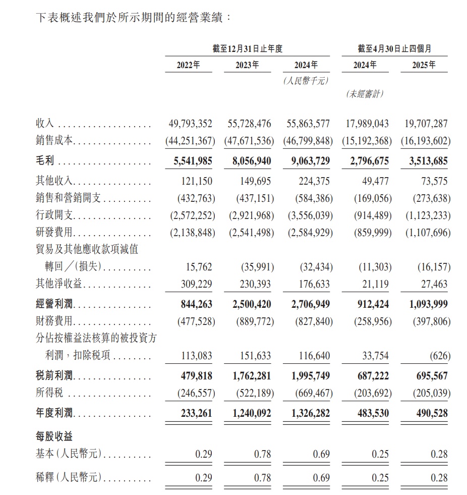 财务方面,于2022年、2023年、2024年、2025年截至4月30日止四个月,均胜电子分别录得收入约为497.93亿元、557.28亿元、558.64亿、197.09亿元人民币,同期利润分别约为2.33亿元、12.40亿元、13.26亿、4.91亿元人民币。
