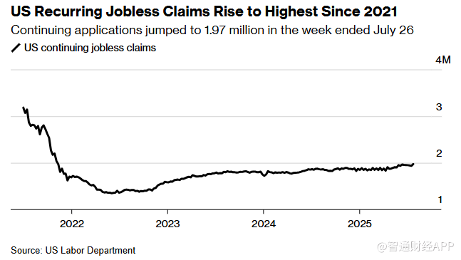 智通财经APP获悉,美国续请失业金人数飙升至2021年11月以来的最高水平,进一步表明劳动力市场正在走弱。根据美国劳工部周四发布的数据,截至7月26日当周续请失业金人数增加3.8万,达到197万人,超出市场预期。美国截至8月2日当周初请失业金人数升至22.6万人,略高于市场预期。