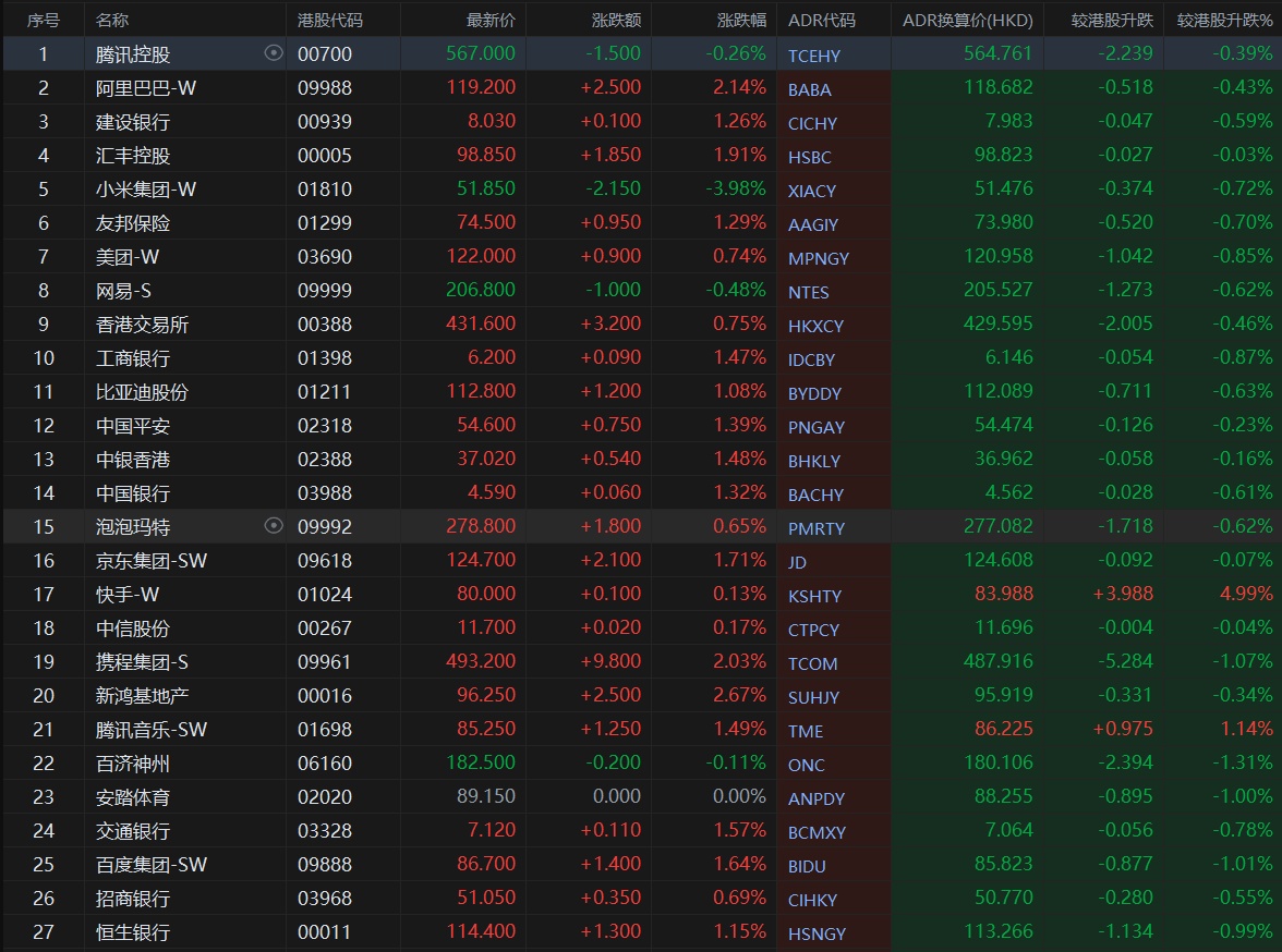 大型蓝筹股多数下跌,汇丰控股收报98.823港元,较香港收市跌0.03%;腾讯控股收报564.761港元,较香港收市跌0.39%。