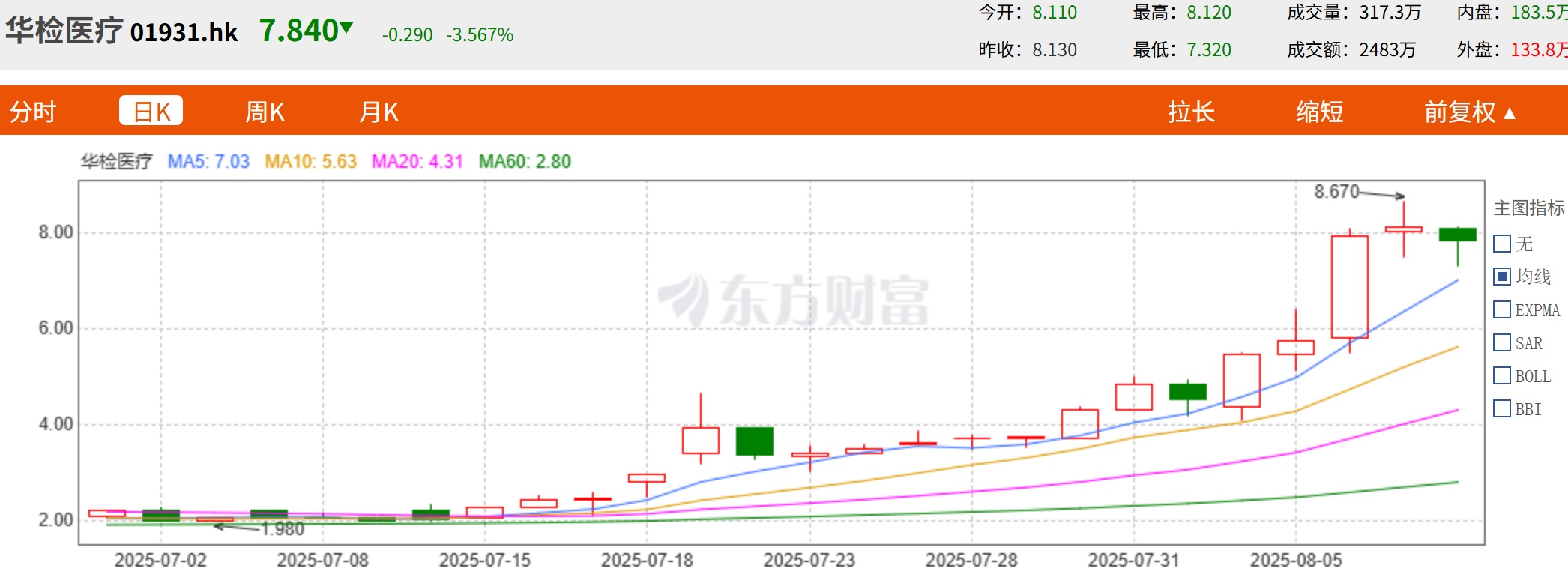 作为全球最大的以太坊金库持有者,Bitmine Immersion Technologies (BMNR)的市值表现同样值得关注。截至8月8日,BMNR实现24.59%涨幅,收报51.43美元/股,市值53.08亿美元。这一数据不仅展示了市场对以太坊金库型上市公司的认可,也为华检医疗的市值增长提供了有力参照。