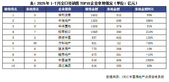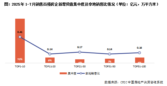 2025年前七月,销售百强房企拿地集中度依旧保持高位。TOP10房企新增货值占百强的比重达到70%,较上月微降3个百分点,但较2024年末增加8个百分点,市场格局进一步集中于头部企业。