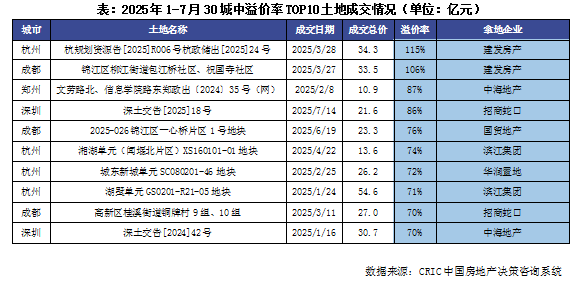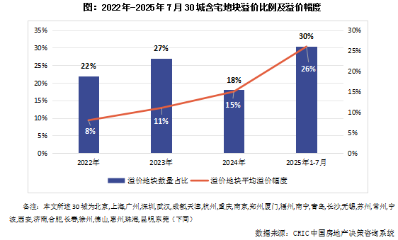 前七月,30城溢价地块数量占比达到30%,为近三年新高,较2024年增加12pts,显然拿地情绪已经被带动起来。而溢价地块的平均幅度同样提升迅猛,2025年前7月为26%,几乎较过去两年成倍增长。