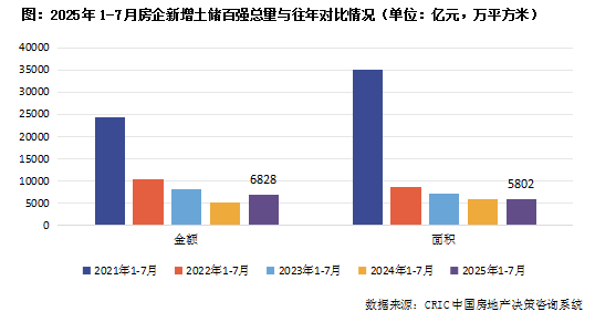 2025年1-7月份新增土储中,百强房企的新增总价和建面之和6828亿元和5802万平方米,金额同比增长33%,涨幅虽然较前六月略有收窄,但连续4年下滑的走势已出现企稳苗头。