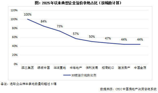 根据CRIC统计,核心30城中,溢价拿地数量大于5块的企业基本是有实力的央国企和深耕杭州的滨江,而溢价拿地占比最高的是滨江、绿城、华润置地,分别达到100%、84%和73%。招商、建发、金茂比重基本在40%之下。