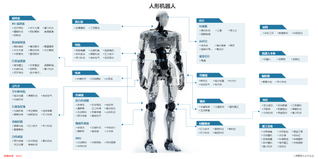 人形机器人从各个部件构成来看,Wind产业链数据显示,有减速器、灵巧手、执行器、电机、传感器、芯片、控制器等10多个大类部件,涉及的相关产业链公司超百家,其中的上市公司比比皆是。