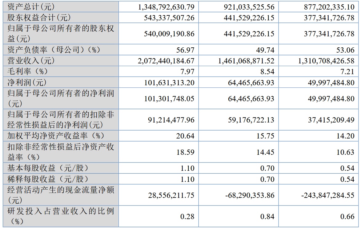 财务方面,于2022年度、2023年度、2024年度,公司实现营业收入分别约为13.11亿元、14.61亿元、20.72亿元,同期实现净利润分别约为4999.75万元、6446.57万元、1.02亿人民币。