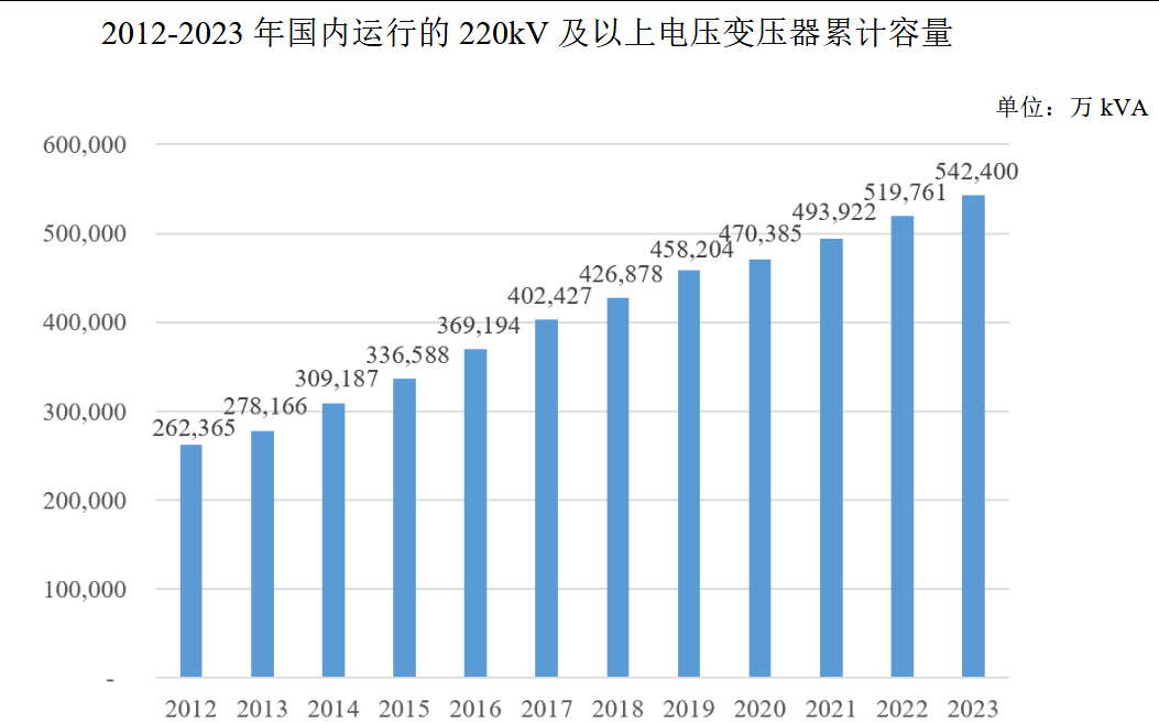 根据IEA电力市场报告,2023年全球电力需求增长了约2.2%。预计未来三年,全球电力需求将以更快的速度增长,到2026年年均增长3.4%。2012年至2023年,我国高电压等级变压器容量逐步提升。中电联数据显示,2012年至2023年,我国220kV及以上电压变压器的累计容量从262,365万kVA增加至542,400万kVA,年复合增长率6.83%。