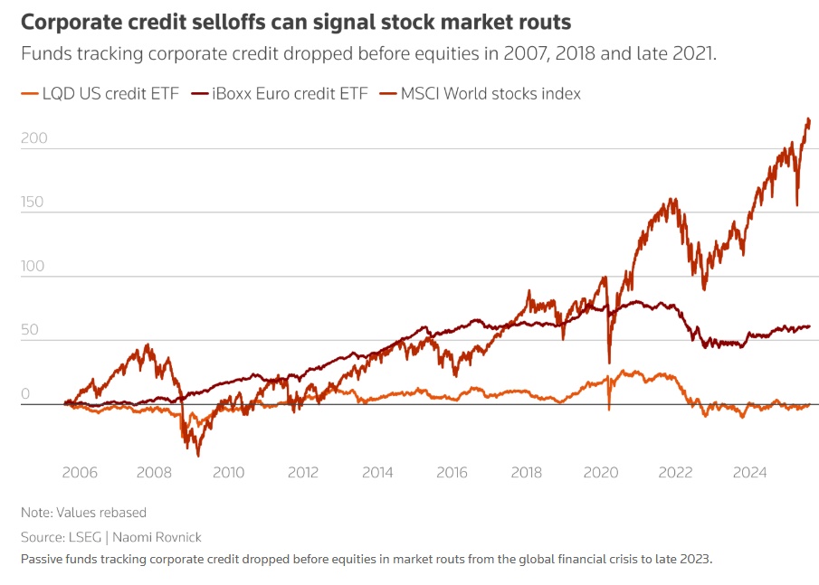 在2018年的中美贸易战导致的全球市场低迷、2022年美联储激进加息引发市场暴跌以及2023年末的类似规模市场震荡之前,跟踪高评级公司信用资产的热门交易型基金(即ETF)在全球股市迈入下行轨迹之前一段时间就已下跌。