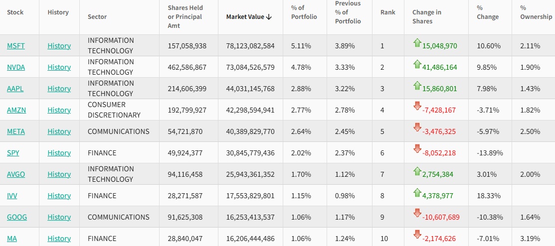 英伟达(NVDA.US)位列第二,持仓4.62亿股,持仓市值约730.85亿美元,占投资组合比例为4.78%,较上季度持仓数量增长9.85%。