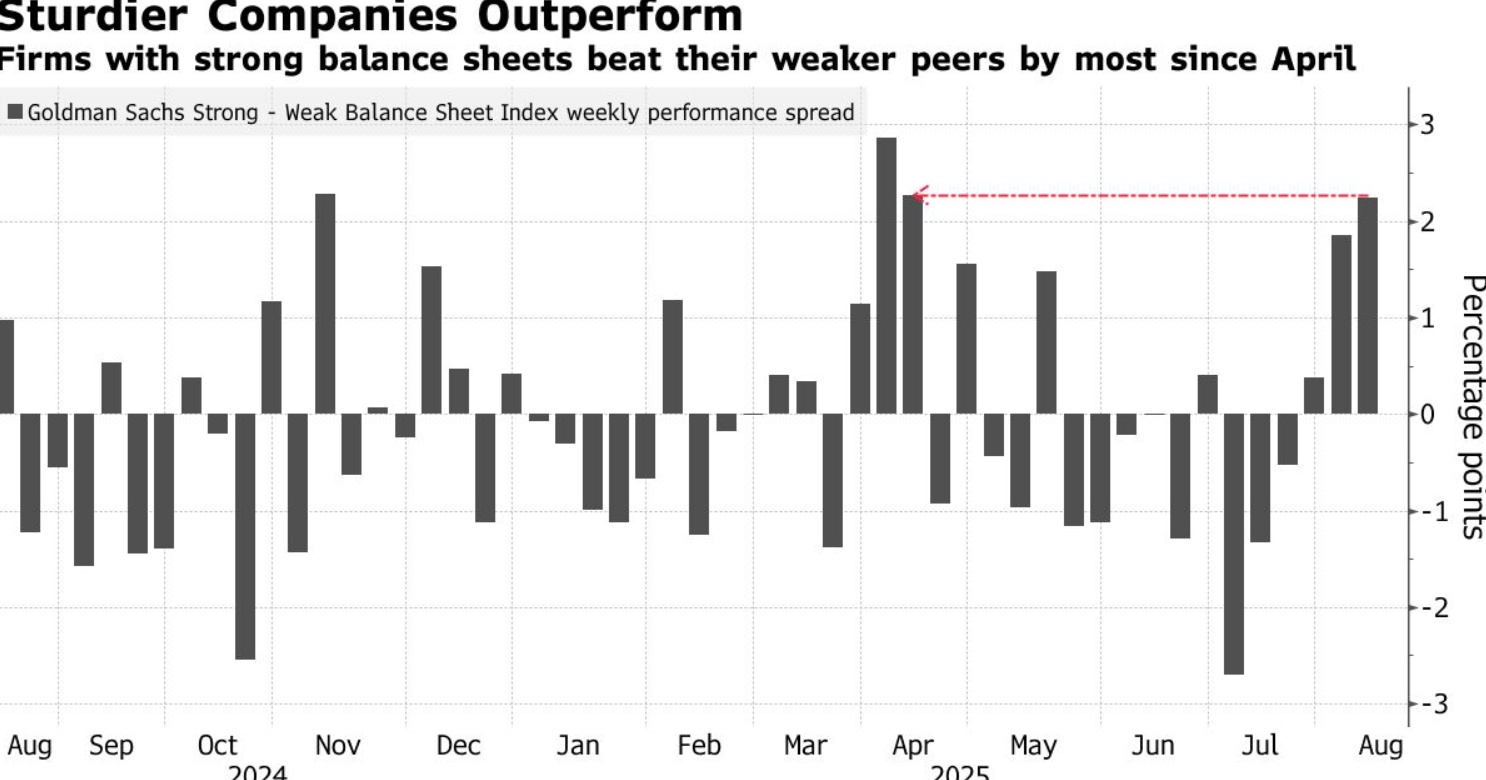 统计数据显示,高盛集团汇编的一篮子资产负债表最为稳健的标普500指数成分公司,相对于财务状况较弱的一篮子该指数成分公司股价表现录得自4月初以来的最佳单周表现。这些现金充裕的公司——包括Fastenal、Palantir Technologies以及West Pharmaceutical Services——已连续三周上涨,为自美国总统唐纳德·特朗普首次在4月宣布激进的对等关税令市场陷入混乱以来持续时间最长的一波涨势。