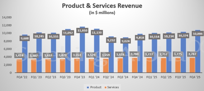其中,网络业务占据了大部分份额,为 73.4 亿美元,与预期的 73.4 亿美元相符。服务收入为 37.9 亿美元。本季度,网络产品订单实现了两位数的增长,主要得益于网络规模基础设施、交换设备、企业路由系统、工业物联网以及服务器等领域的产品。