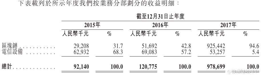 财务数据方面,公司收益截至2015年12月31日止年度的9210万大幅增加至截至2016年12月31日止年度的1.2亿元,并进一步升至截至2017年12月31日止年度的近9.79亿元。其中94.6%来自区块链业务,5.4%来自电信设备业务。截至2015年、2016年及2017年12月31日止年度的年度溢利分別为2420万元、1110万元及3.85亿元。