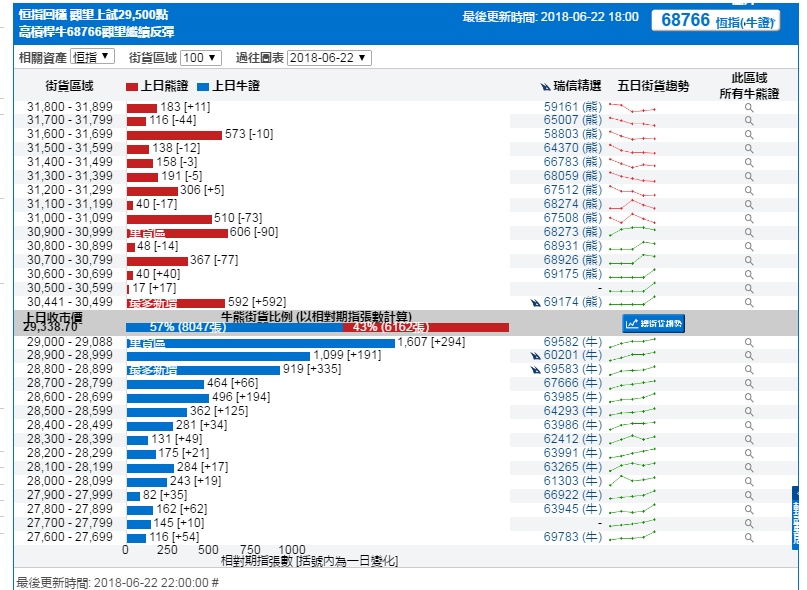 智通财经APP获悉,截至6月22日,恒指最新的牛熊街货比例为57:43。从瑞信恒指牛熊证街货分布图中得到的数据显示,熊证街货重货区在30900-30999区间,此区间最新的熊证数量为606张,比上一交易日减少90张,最多新增落在30441-30499这一区间,新增592张。牛证中重货区在29000-29099区间,该区间最新牛证数量为1607张,比上一交易日增加294张;最多新增落在28800-28899这一区间,新增335张。