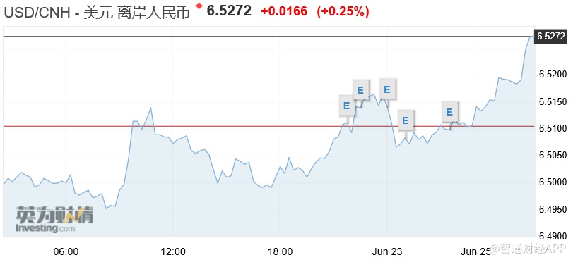 智通财经APP获悉,6月25日,离岸人民币兑美元早盘跌逾160点,报6.5272,连续八天下跌,为2016年以来最长连跌纪录。