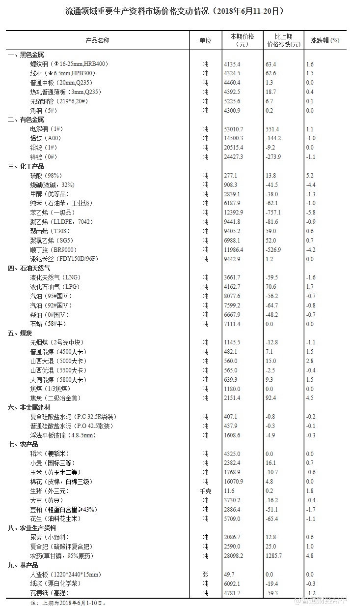据对24个省(区、市)流通领域9大类50种重要生产资料市场价格的监测显示,2018年6月中旬与6月上旬相比,18种产品价格上涨,23种下降,9种持平。其中,焦炭价格上涨4.5%,农药价格上涨4.8%,涨幅较大,生猪价格上涨1.8%。、