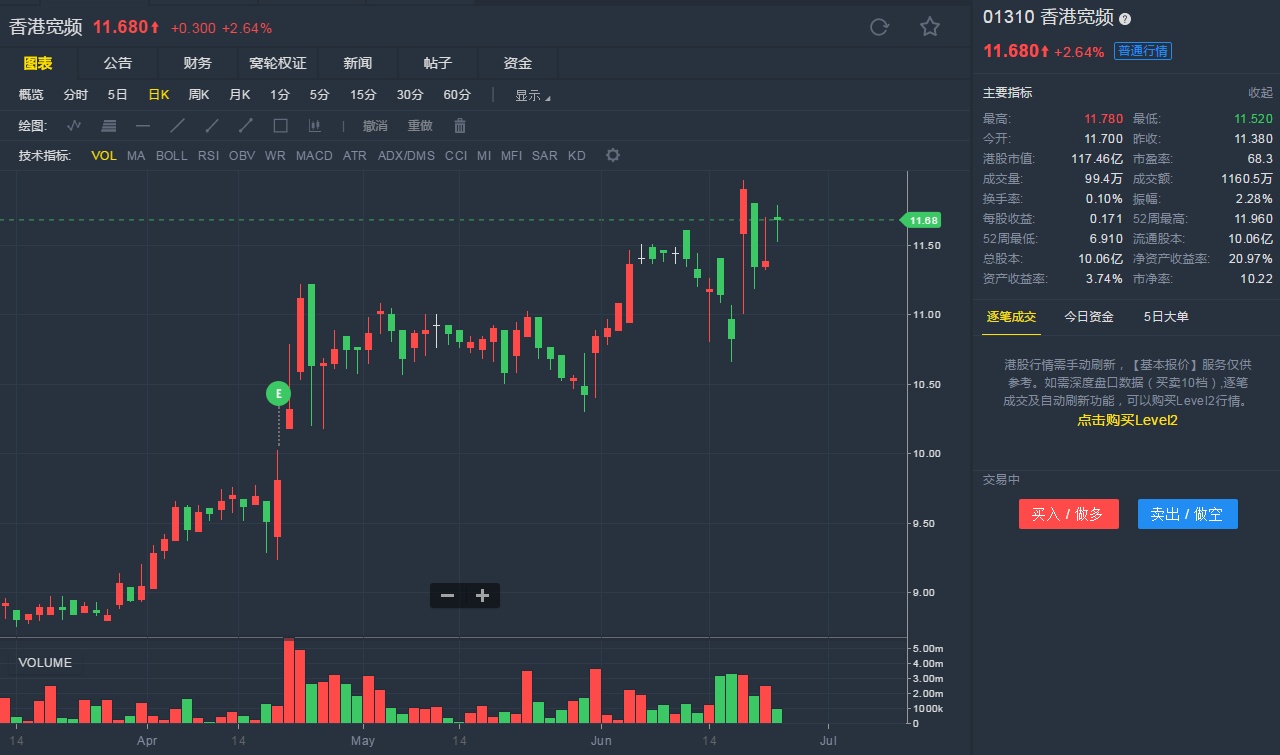 截至6月25日10:53,香港宽频涨2.64%,报11.68港元。