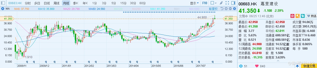 另一香港地产发展商嘉里建设(00683)也是高管集中减持套现的目标,从1月开始,公司执行董事、主席及总裁相继抛售公司股份,但不同于九龙仓的是,嘉里建设股价依然稳步向上,甚至在上周二(6月19日)创10年来新高,其中主要原因是今年以来港岛东写字楼租金升幅高于香港平均水平,以及九龙塘毕架山新项目即将推出。