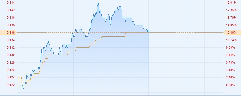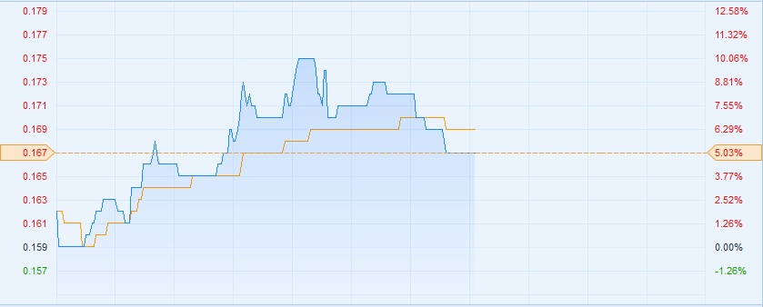 五龙动力涨5.03%,报价0.167港元,成交额为574万港元。