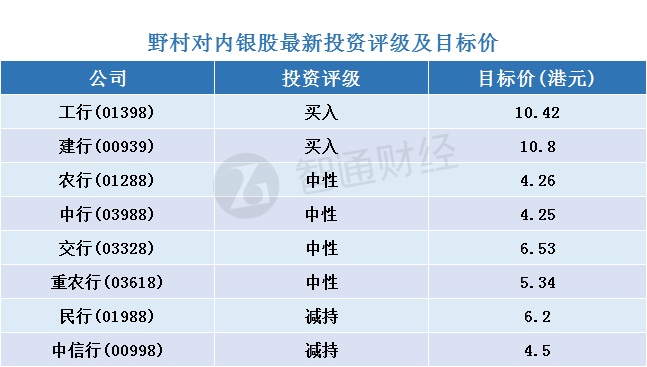 智通财经APP整理,野村对内银股最新投资评级及目标价如下: