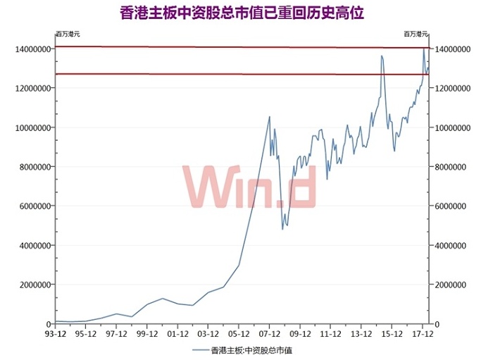 Wind数据显示,截至5月份,香港主板中资股总市值达12.84万亿港币,占比达36.95%,该市值规模已与2015年牛市规模相近。而就在今年1月份,中资股总市值一度达14.07万亿港币,创出历史新高。