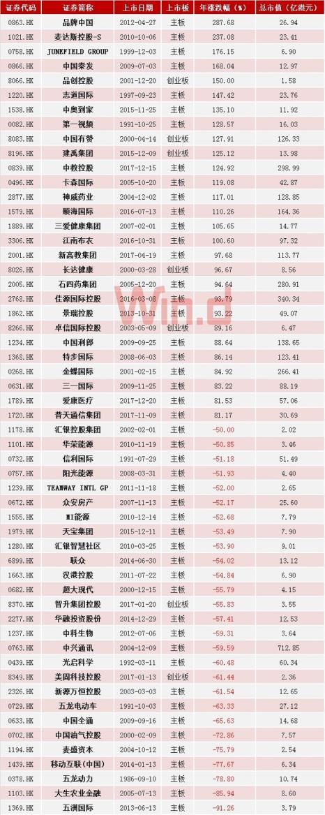 其中,有16只个股的涨幅超100%,另有27只个股跌幅超过50%。