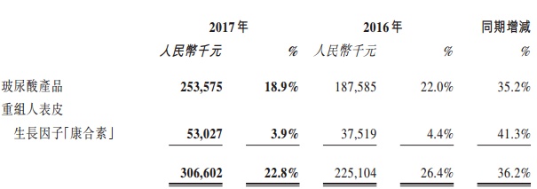 至于骨科板块,其整体增速是处于下滑的,同比下降7.4%,约2.66亿元。其中,骨科玻璃酸钠注射液产品录得收入约为1.82亿元,较2016年的2.02亿元下降约人民币1999万元,降幅约为9.9%;医用几丁糖也微跌了1.4个百分点。