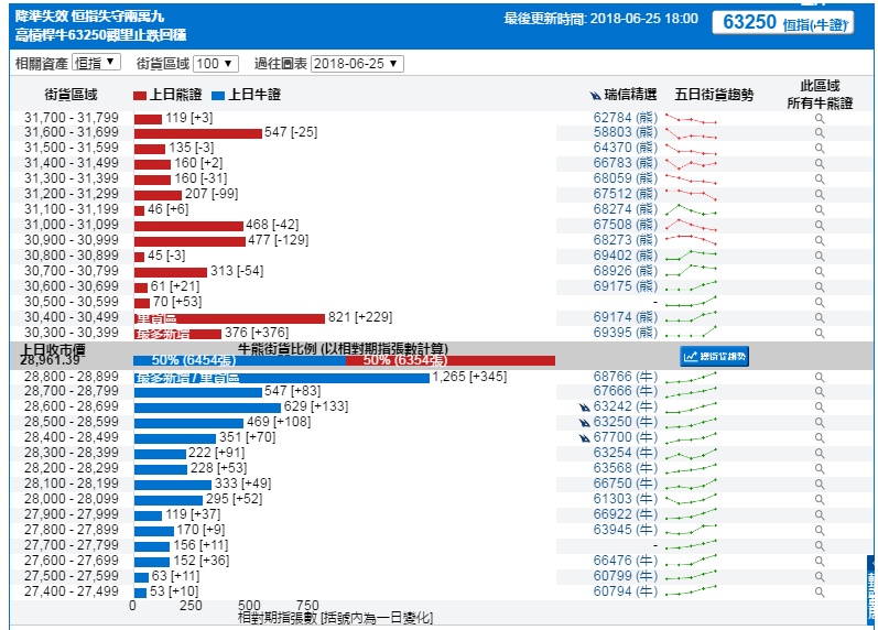 智通财经APP获悉,截至6月25日,恒指最新的牛熊街货比例为50:50。从瑞信恒指牛熊证街货分布图中得到的数据显示,熊证街货重货区在30400-30499区间,此区间最新的熊证数量为821张,比上一交易日增加229张,最多新增落在30300-30399这一区间,新增376张。牛证中重货区在28800-28899区间,该区间最新牛证数量为1265张,比上一交易日增加345张;最多新增也落在这一区间。