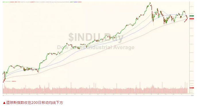 标普500指数下跌1.4%,报2717.07点,一度下跌逾2%;道琼斯指数下跌1.3%,报24252.80点,收在200天移动均线下方;纳斯达克综合指数下跌2.1%,报7532.01点。