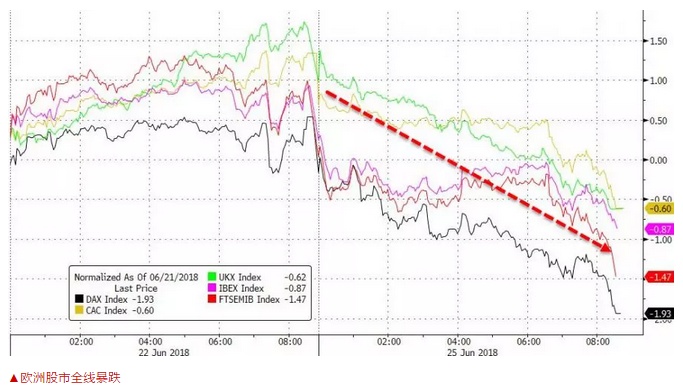 欧洲股市也跟随大跌,斯托克600指数收低2%,斯托克50指数跌2.1%,富时100指数重挫2.2%,德国DAX下跌2.5%,法国CAC40指数跌1.9%。