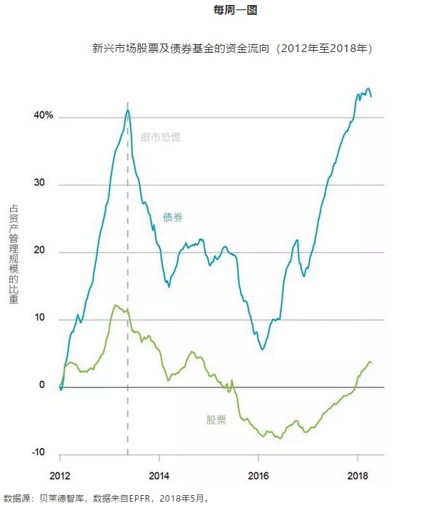 附注:曲线代表流入新兴市场共同基金及交易型开放式指数基金的累计资金,以流入资金占期初资产管理规模的百分比表示。债券基金包括硬通货及当地货币债券基金。垂直线标明2013年的“退市恐慌”,即美联储时任主席伯南克表示,美联储或会开始削减资产购买计划规模,导致美国国债收益率飙升,触发资金开始自新兴市场资产流出的时期。