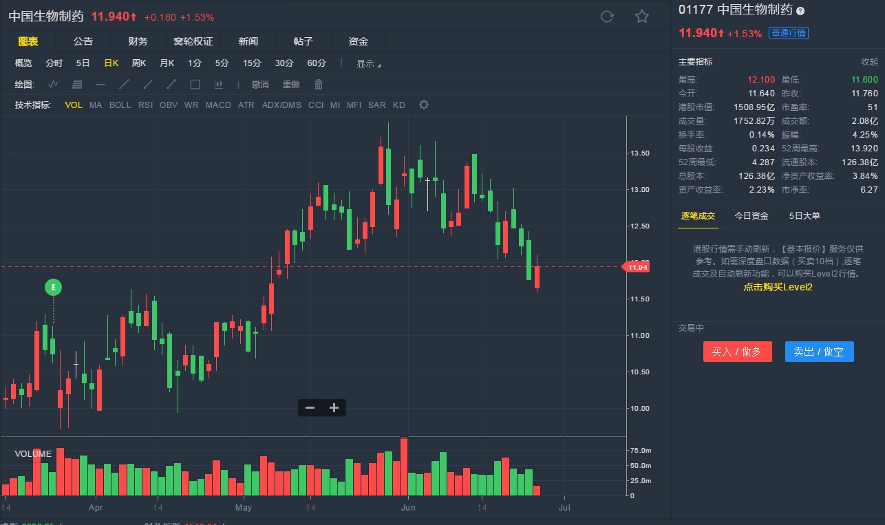 截至6月26日10:21,中国生物制药涨1.53%,报11.94港元。