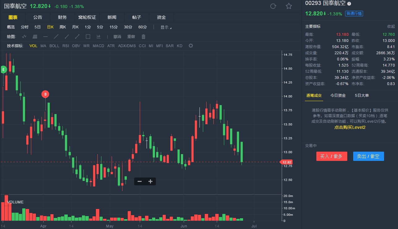 截至6月26日10:26,国泰航空跌1.38%,报12.82港元。