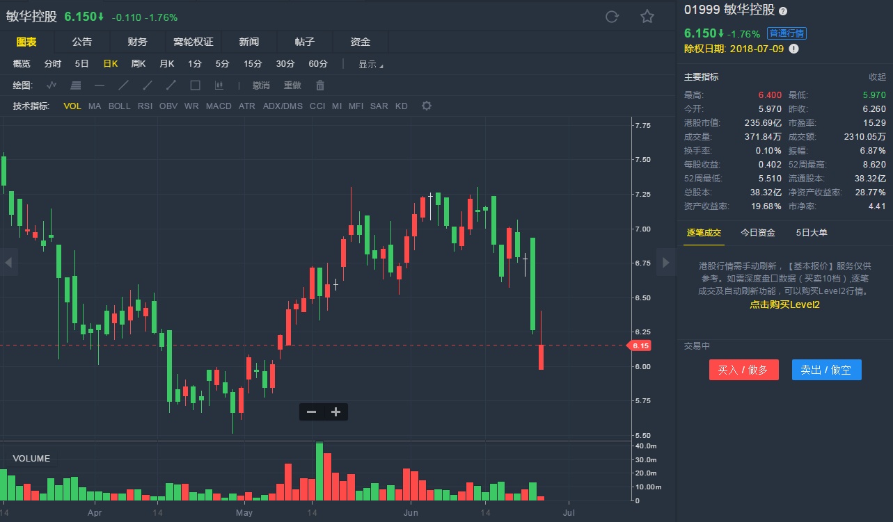 截至6月26日10:37,敏华控股跌1.76%,报6.15港元。