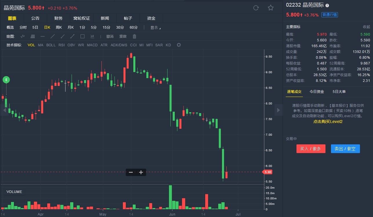 截至6月26日10:42,晶苑国际涨3.76%,报5.8港元。