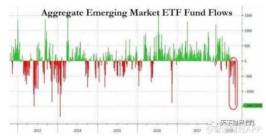 6月11日至6月15日当周,在美国上市交易的新兴市场相关ETF基金,创下2014年1月来最大整体资金流出规模。其中,有27亿美元的资金从发展中国家及地区等相关的ETF基金撤出,为一年多以来最高单周流出量,且是前一周的7倍左右。