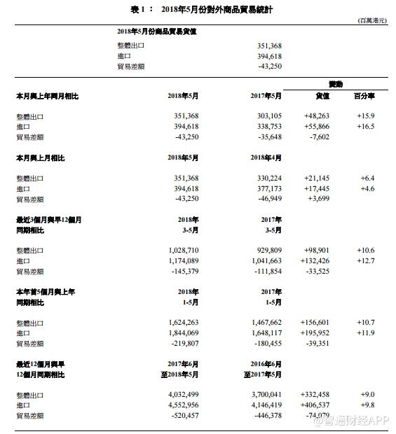 经季节性调整的数字显示,截至2018年五月底的三个月与上三个月比较,商品整体出口货值取得3.5%的升幅。同时,商品进口货值上升4.0%。