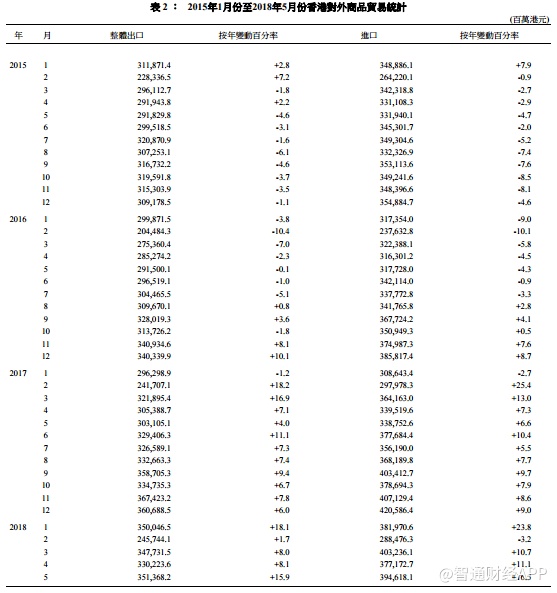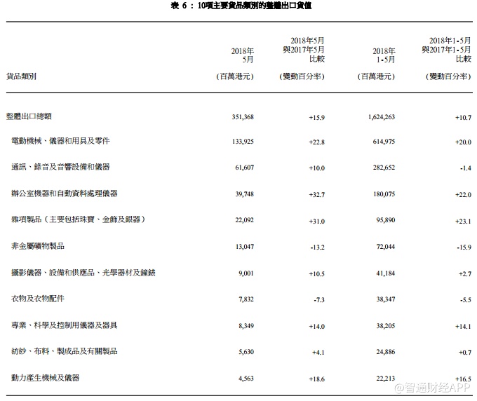 首五个月与2017年同期比较,部分主要货品类别的整体出口货值取得升幅,尤其是“电动机械、仪器和用具及零件”(增1025亿元,升20.0%)、“办公室机器和自动资料处理仪器”(增325亿元,升22.0%)和“杂项制品(主要包括珠宝、金饰及银器)”(增180亿元,升23.1%)。然而,“非金属矿物制品”的整体出口货值则下跌(减136亿元,跌15.9%)。
