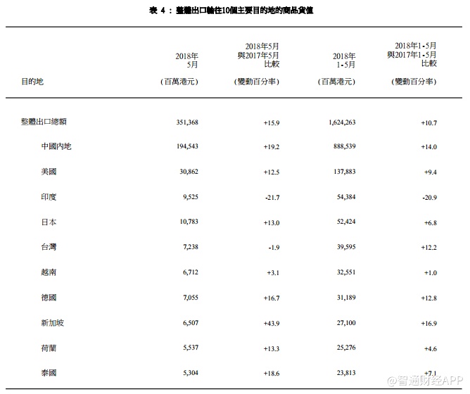 首五个月输往大部分主要目的地的整体出口货值同比取得升幅,尤其是新加坡(升16.9%)、内地(升14.0%)、德国(升12.8%)、台湾(升12.2%)、美国(升9.4%)和泰国(升7.1%)。然而,输往印度的整体出口货值则下跌20.9%。
