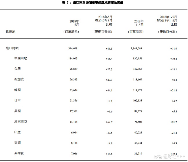 同期,来自大部分主要供应地的进口货值取得升幅,尤其是马来西亚(升69.7%)、韩国(升44.1%)、台湾(升22.3%)、新加坡(升20.3%)、菲律宾(升18.8%)和内地(升18.4%)。同时,来自印度的进口货值则下跌39.5%。