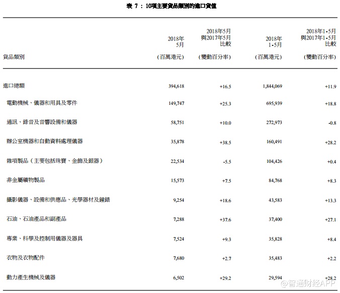 同期,大部分主要货品类别的进口货值上升,尤其是“电动机械、仪器和用具及零件”(增303亿元,升25.3%)、“办公室机器和自动资料处理仪器”(增100亿元,升38.5%)和“通讯、录音及音响设备和仪器”(增53亿元,升10.0%)。然而,“杂项制品(主要包括珠宝、金饰及银器)”的进口货值下跌(减13亿元,跌5.5%)。