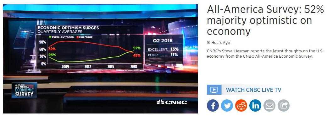 在周一(6月25日)公布的“CNBC全美经济调查” (CNBC All America Economic Survey)中显示,54%的受访者认为,美国经济现在表现良好或是极好,这一比例创下了CNBC此项调查十年历史上的最高纪录;与此同时,仅有43%受访者认为经济状况只是过得去或是糟糕,这一比例则创下了调查历史上的最低纪录。