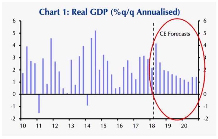 根据凯投宏观在最新的《美国经济展望》报告中预期,在财政刺激的推动下,美国今年的GDP增长将可达到2.9%,但随着刺激力度的减弱和利率上升对经济的拖累更大,2019年经济增速将放缓至2.0%,2020年仅为1.3%。