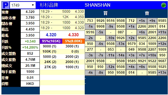 智通财经APP获悉,服装经销商杉杉品牌(01749)将于明日挂牌,上市前夕,据辉立交易场资料显示,杉杉品牌暗盘开市报3.95元,较招股价3.78元,升0.17元,收报4.32元,较招股价升14.286%,每手1000股,不计手续费,每手赚540元。