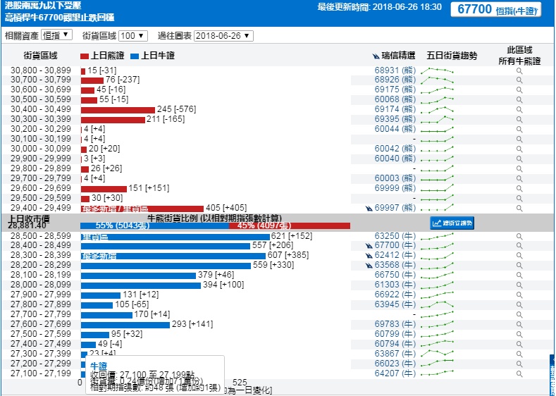 智通财经APP获悉,截至6月26日,恒指最新的牛熊街货比例为55:45。从瑞信恒指牛熊证街货分布图中得到的数据显示,熊证街货重货区在29400-29499区间,此区间最新的熊证数量为405张,比上一交易日增加405张,最多新增也落在这一区间。牛证中重货区在28500-28599区间,该区间最新牛证数量为621张,比上一交易日增加152张;最多新增落在28300-28399这一区间,新增385张。