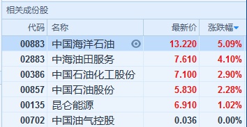 智通财经APP获悉,受美国国务院下达对伊朗原油进口限制令影响,国际油价周二盘中快速拉升,今早港股石油股纷纷高开运行,三桶油领涨蓝筹。截至9时41分,中国海洋石油(00883)涨5.09%;中海油田服务(02883)涨4.1%;中国石油化工股份(00386)和中国石油股份(00857)涨超2%;昆仑能源(00135)涨1.02%。