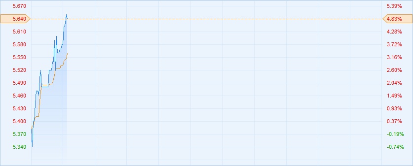 智通财经APP获悉,特步国际(01368)开盘后迅速拉升,截至10时01分,涨5.02%,报价5.65港元,成交额为1134万港元。