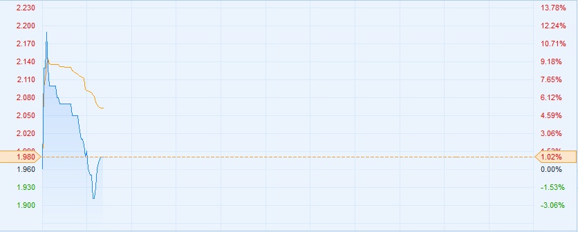 智通财经APP获悉,香港国际建投(00687)复牌,股价上升,盘中一度升12.24%高见2.2港元。截至10时07分,该股升幅收窄至1.02%,报价1.98港元,成交额为78.81万港元。