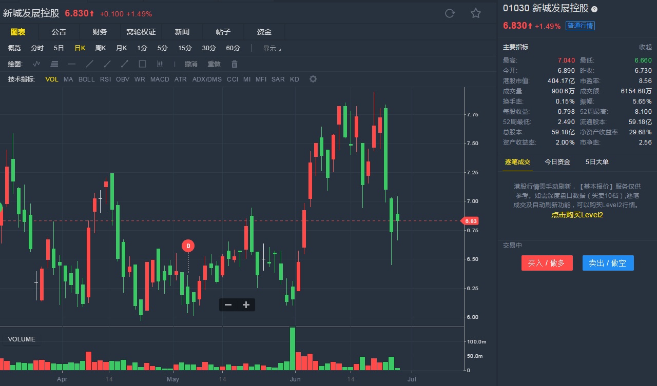 截至6月27日10:37,新城发展控股涨1.49%,报6.83港元。